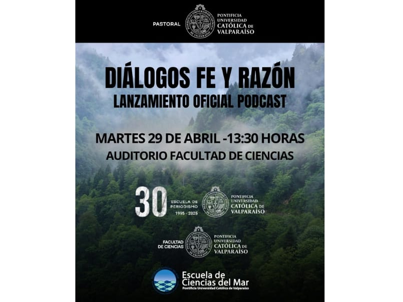 La Pastoral PUCV, en colaboración con la Escuela de Periodismo y la participación de la Facultad de Ciencias y la Escuela de Ciencias del Mar, invitan a toda la comunidad universitaria al estreno de su nuevo podcast “Diálogos Fe y Razón”, que se presentará el martes 29 de abril en la Facultad de Ciencias.