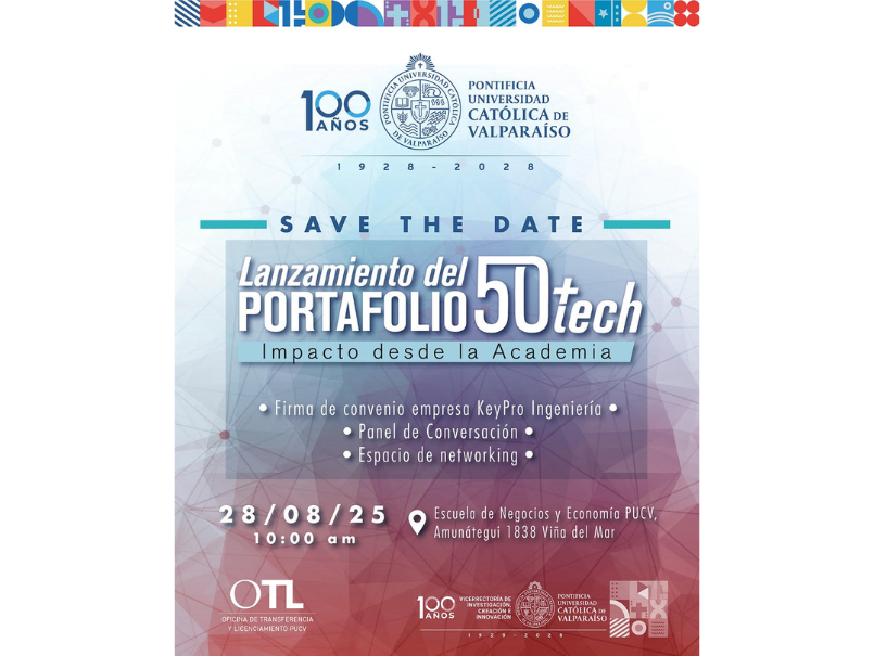 La Oficina de Transferencia y Licenciamiento (OTL) de la Vicerrectoría de Investigación, Creación e Innovación de la PUCV, invita a la comunidad universitaria a participar del Lanzamiento Portafolio PUCV 50 Tech: Impacto desde la Academia.