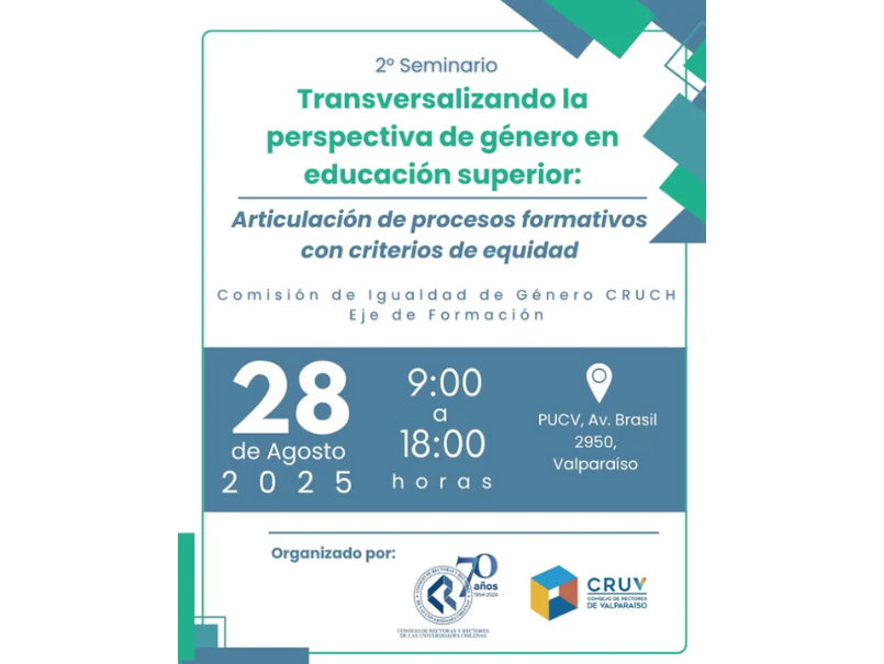 El jueves 28 de agosto se realizará el II Seminario “Transversalizando la perspectiva de género en educación superior: articulando procesos formativos con criterios de equidad”, organizado por la Comisión de Igualdad de Género del Consejo de Rectoras y Rectores de las Universidades Chilenas (CRUCH).