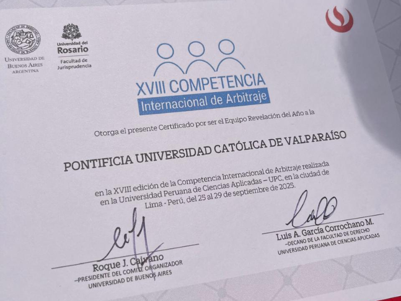 El equipo de la Escuela de Derecho de la Pontificia Universidad Católica de Valparaíso (PUCV) obtuvo dos importantes reconocimientos en la XVIII Competencia Internacional de Arbitraje, coorganizada por la Facultad de Derecho de la Universidad de Buenos Aires (UBA) y la Facultad de Jurisprudencia de la Universidad del Rosario (Bogotá), que este año se desarrolló en la Universidad Peruana de Ciencias Aplicadas (UPC), en Lima, Perú.