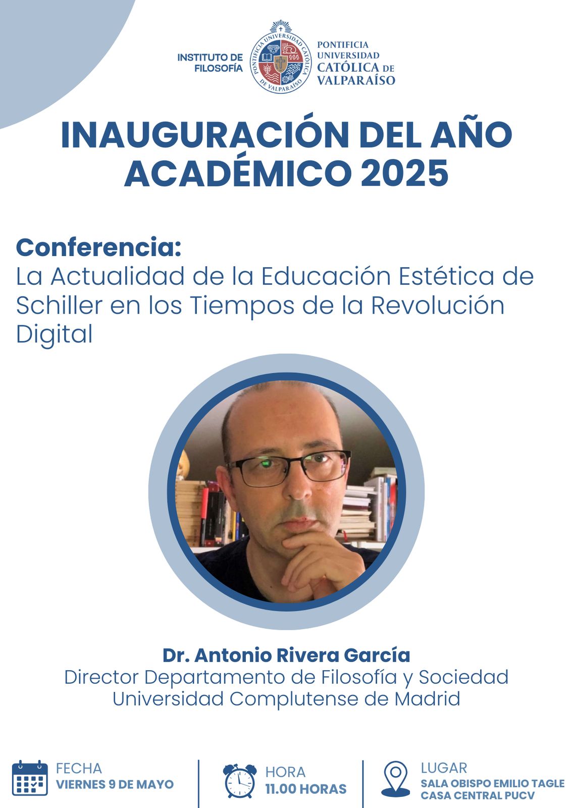 El Instituto de Filosofía de la Pontificia Universidad Católica de Valparaíso inaugurará oficialmente su Año Académico 2025 con una conferencia magistral titulada "La Actualidad de la Educación Estética de Schiller en los Tiempos de la Revolución Digital", a cargo del destacado académico Dr. Antonio Rivera García, Director del Departamento de Filosofía y Sociedad de la Universidad Complutense de Madrid.