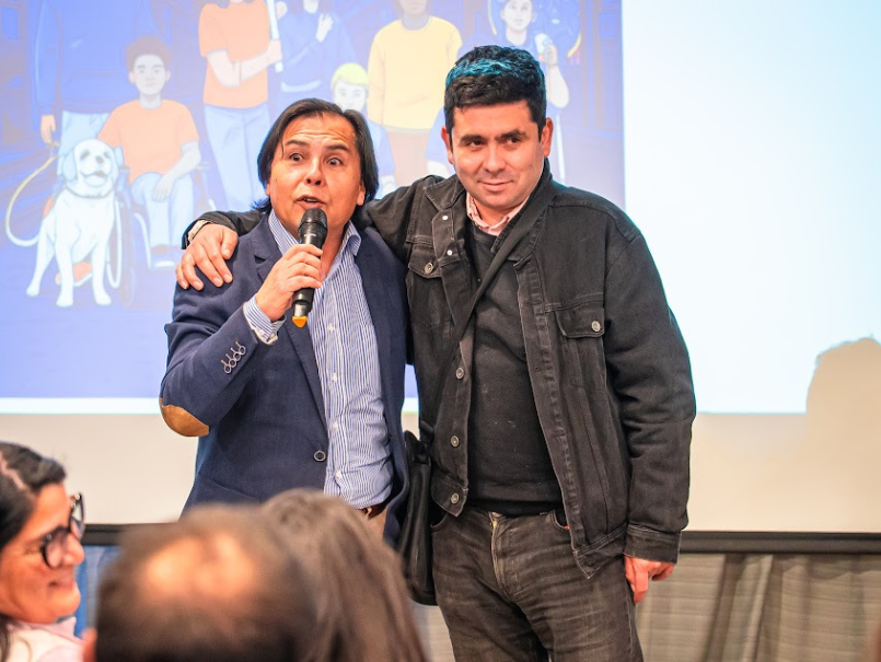 Descripción de imagen: Alejandro Parra abraza a moderador del espacio, tras haber participado en la instancia. Sonríe a la audiencia presente.
