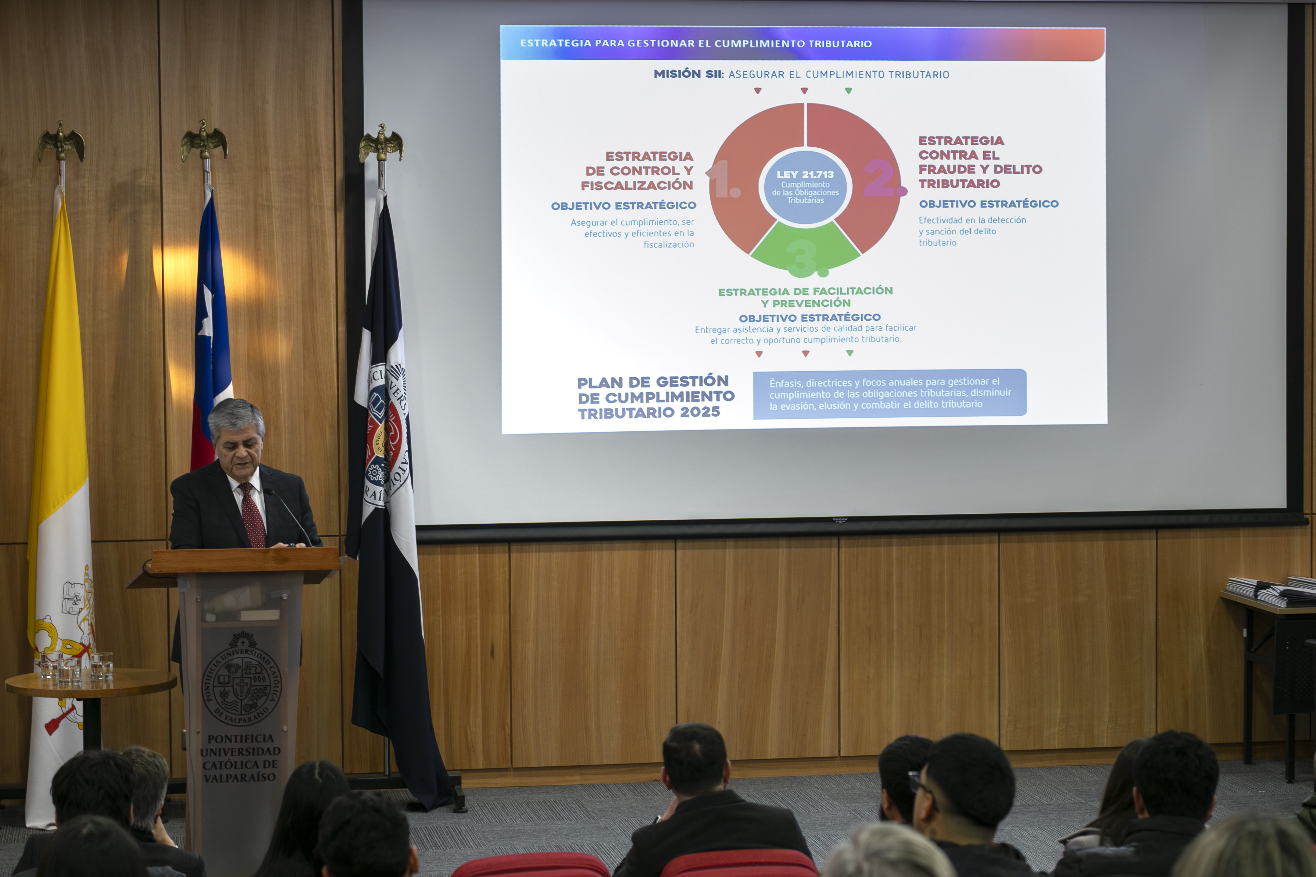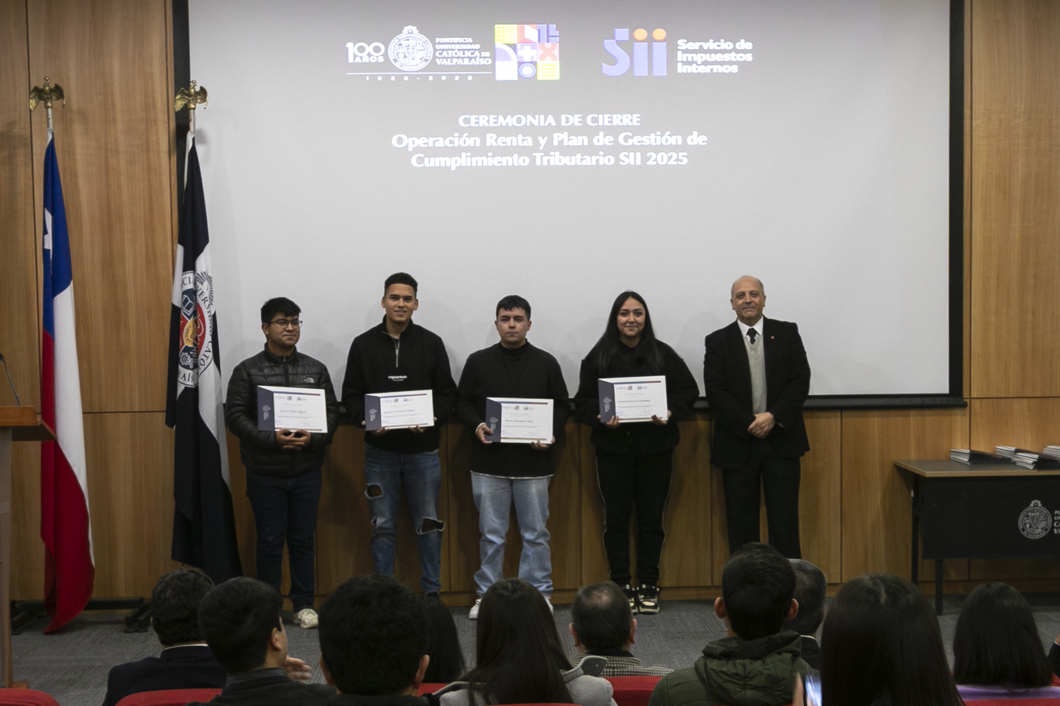 Con la presencia del rector de la Pontificia Universidad Católica de Valparaíso, Nelson Vásquez, se realizó la ceremonia de cierre de la Operación Renta y del Plan de Gestión de Cumplimiento Tributario (PGCT) 2025, actividad organizada por la Facultad de Ciencias Económicas y Administrativas (FACEA) en colaboración con el Servicio de Impuestos Internos (SII) y la participación activa de la Escuela de Comercio.