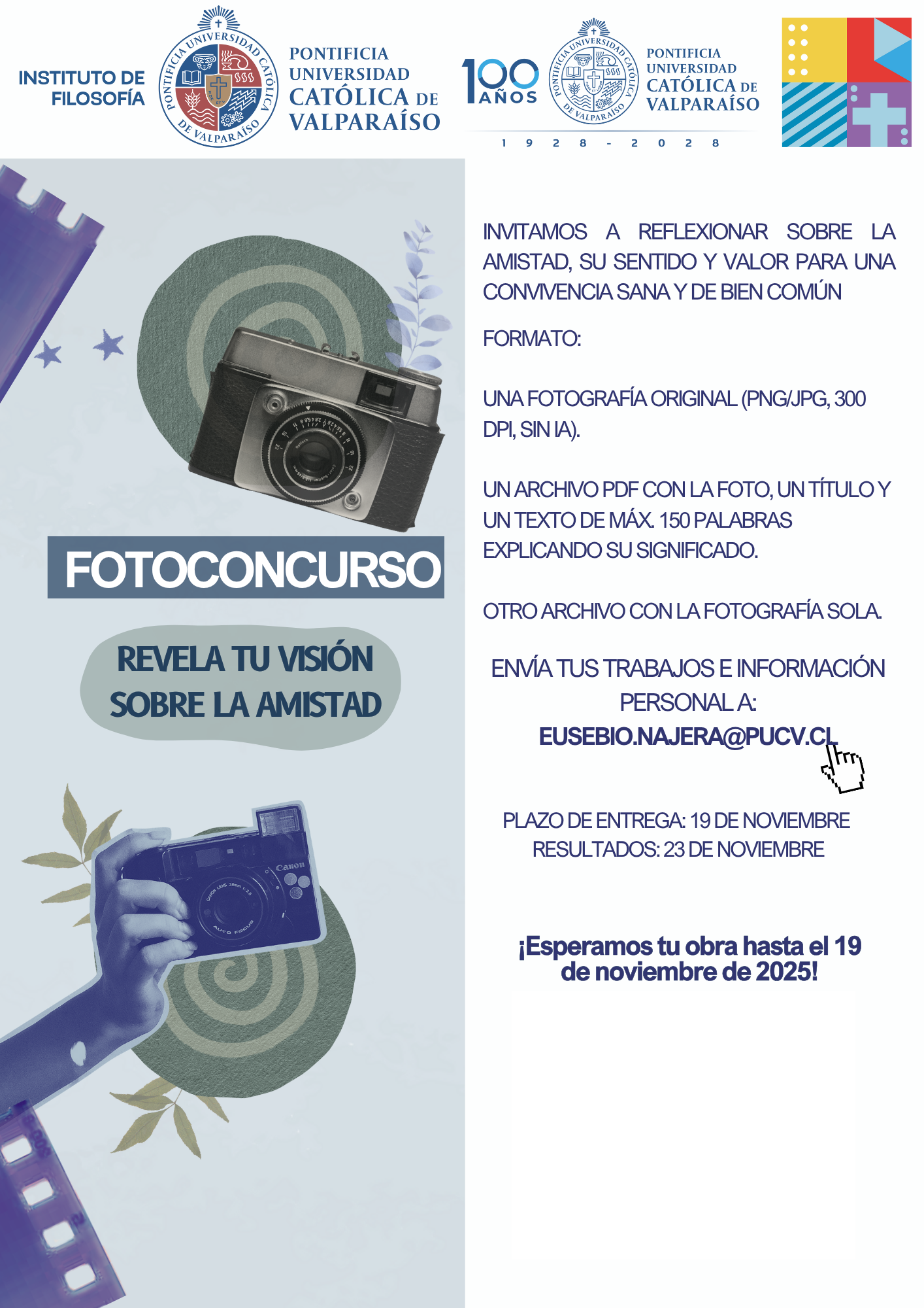 El Instituto de Filosofía de la Pontificia Universidad Católica de Valparaíso lanzó oficialmente la convocatoria del Fotoconcurso “Revela tu visión sobre la amistad”, una iniciativa que invita a explorar, a través de la creatividad visual, el significado de la amistad y su aporte a una convivencia sana y orientada al bien común.