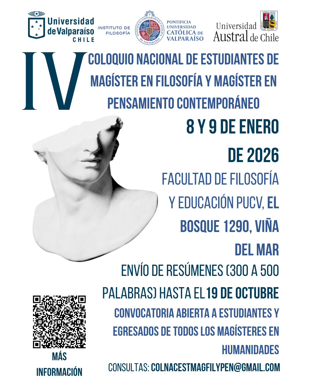 La Pontificia Universidad Católica de Valparaíso, junto con la Universidad Austral de Chile y la Universidad de Valparaíso, invitan a la cuarta versión del Coloquio Nacional de Estudiantes de Magíster en Filosofía y Magíster en Pensamiento Contemporáneo.