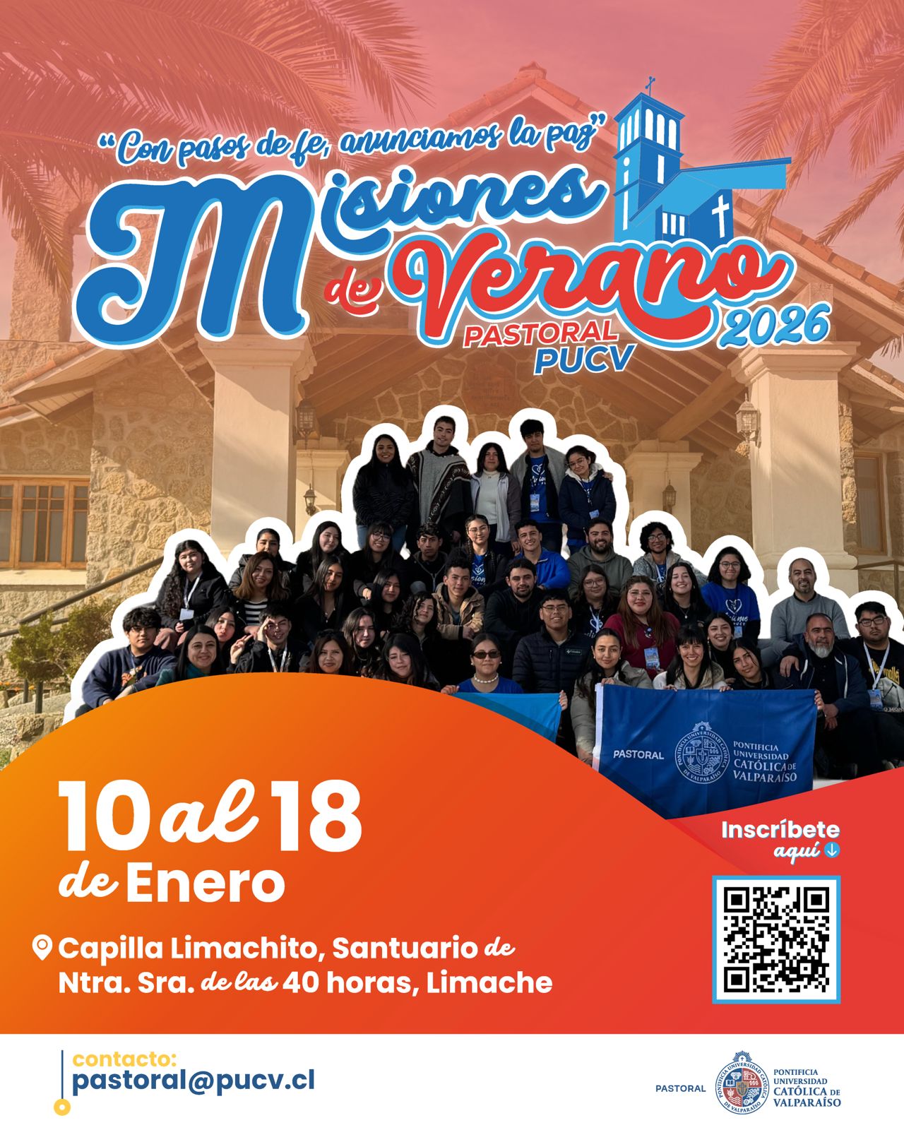 Entre el 10 y el 18 de enero, la Pastoral PUCV llevará a cabo sus Misiones de Verano en la ciudad de Limache, bajo el lema “Con pasos de fe, anunciamos la paz”. Esta experiencia forma parte del Eje de Servicio Misionero de la Pastoral y busca compartir la alegría del Evangelio a través del encuentro, la oración y el trabajo comunitario junto a las comunidades locales.