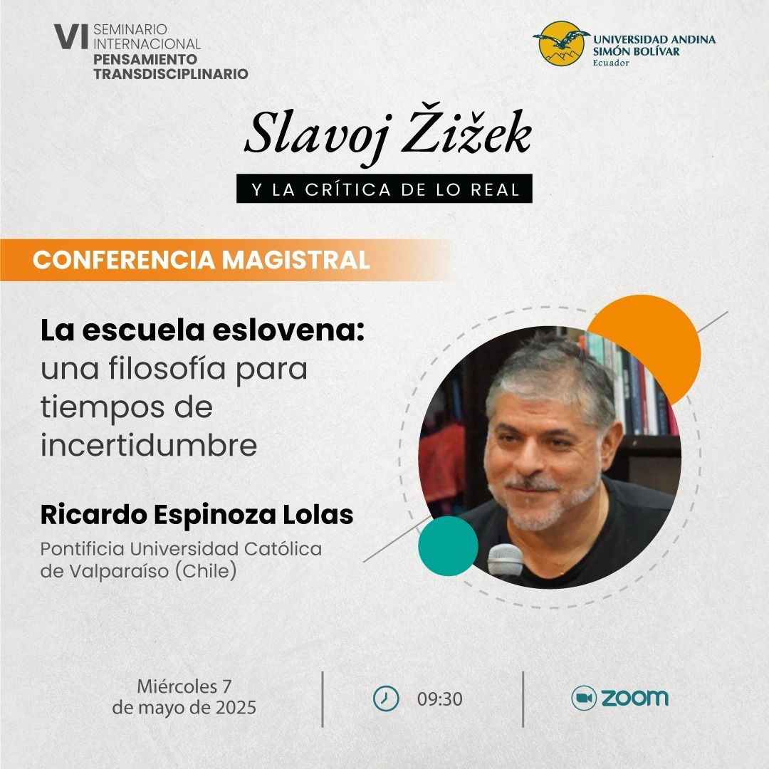La ponencia, titulada “La escuela eslovena: una filosofía para tiempos de incertidumbre”, se enmarca en el eje temático Slavoj Žižek y la crítica de lo real, abordando las contribuciones de la corriente filosófica eslovena —en particular, su lectura de Lacan y Hegel— frente a los desafíos contemporáneos. La actividad se realizará en formato virtual, a través de la plataforma Zoom, a las 09:30 horas (hora local de Ecuador).
