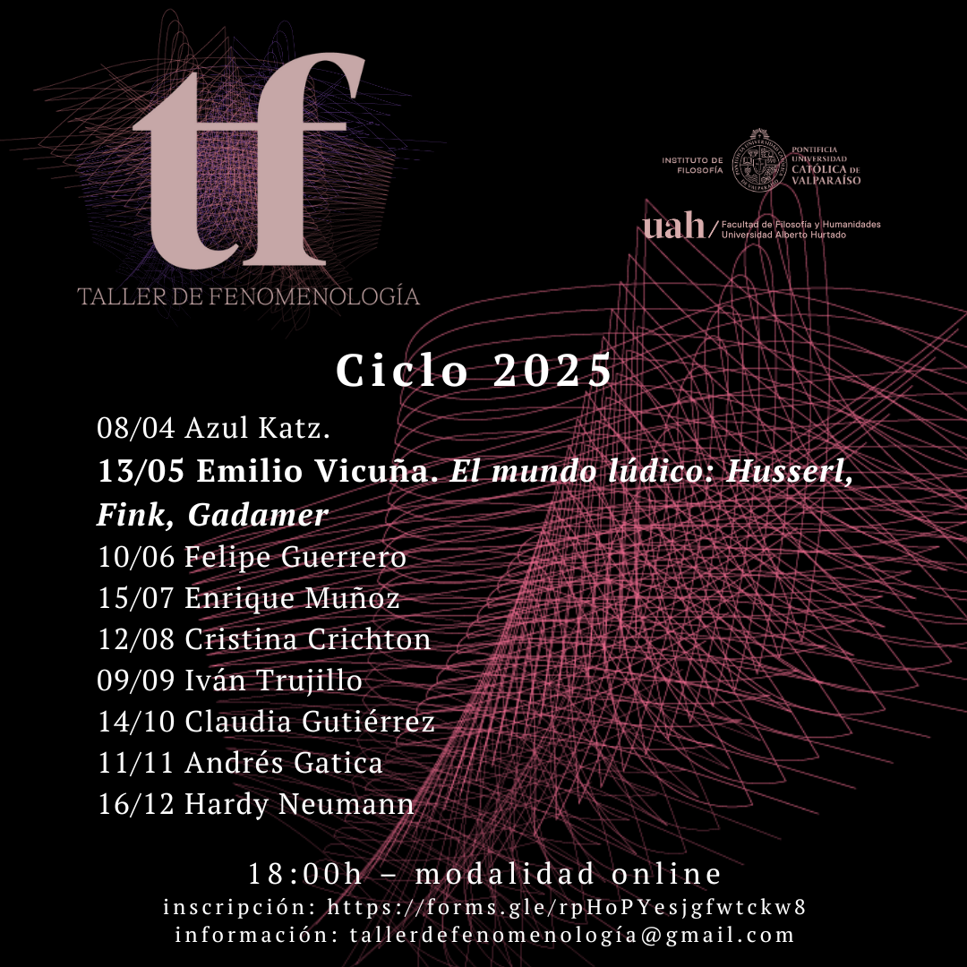 La segunda sesión del Taller de Fenomenología tendrá lugar el martes 13 de mayo a las 18:00 hrs (GMT-3). En esta ocasión tendremos al profesor Dr. Emilio Vicuña, académico de la UC, con una exposición titulada "El mundo lúdico: Husserl, Fink, Gadamer".