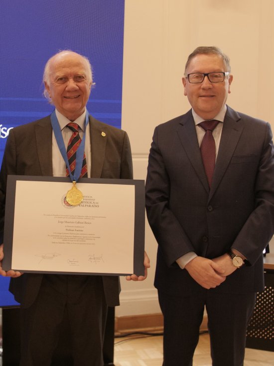 En el Salón de Honor de la Casa Central se desarrolló la ceremonia que confirió el grado de Profesor Emérito de la Pontificia Universidad Católica de Valparaíso al académico del Instituto de Estadística, Jorge Galbiati.