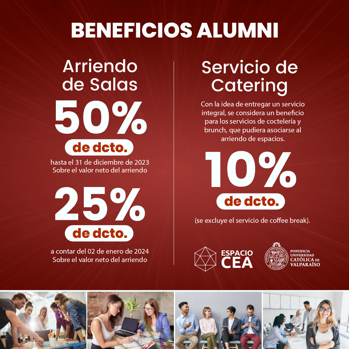 * Descuento especial en arriendo de espacios en el CEA-PUCV Stgo: Desde el 1 de agosto hasta el 31 de diciembre 2023: 50% de descuento.