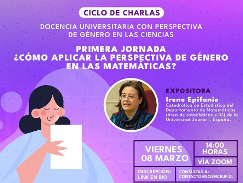 En este contexto, el viernes 08 de marzo, a las 14 horas, realizará la primera charla, “Cómo aplicar la perspectiva de género en las matemáticas”, la que estará a cargo de Irene Epifanio López, catedrática de Estadística e Investigación Operativa en la Universitat Jaume I (UJI) de Castellón.