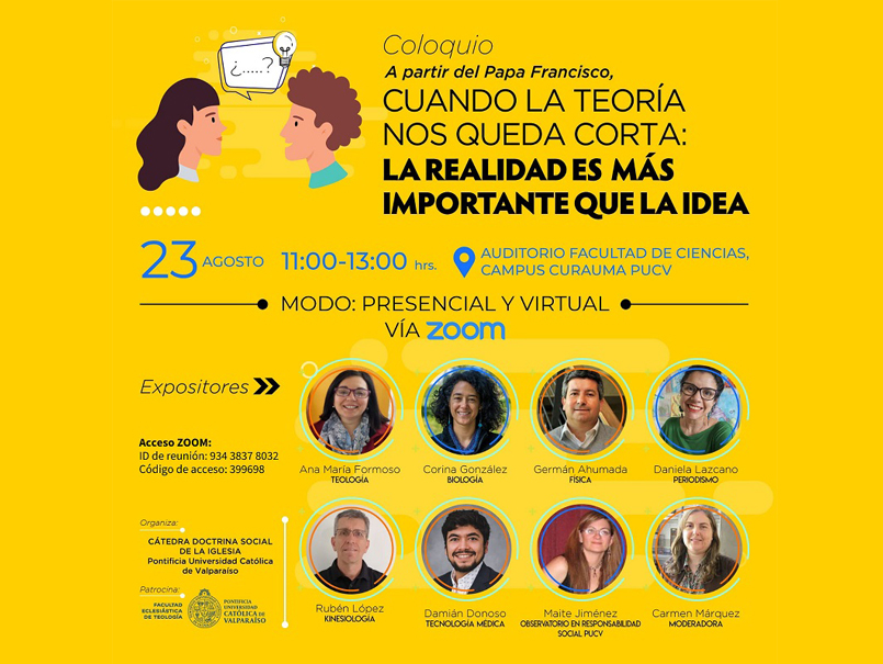 El miércoles 23 de agosto, a partir de las 11 horas, se realizará el coloquio “A partir del Papa Francisco, cuando la teoría nos queda corta: La realidad es más importante que la idea” en el Auditorio de la Facultad de Ciencias del Campus Curauma.