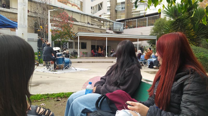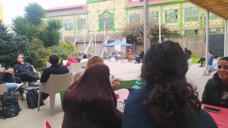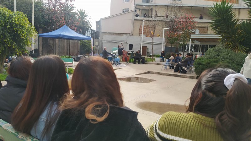 El conjunto Aconcagua Jazz Trío se presentó en el patio del Edificio Gimpert en el cierre de la temporada del primer semestre del programa “Más arte, más cultura en tu campus”, organizado por la Dirección Artístico Cultural y la Dirección de Asuntos Estudiantiles de la Pontificia Universidad Católica de Valparaíso.