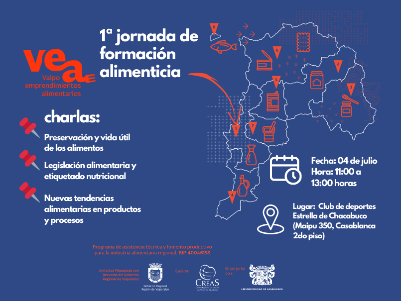 Valparaíso se prepara para recibir la Primera Jornada de Formación Alimenticia de "VEA: Valpo Emprendimientos Alimentarios", evento bajo el alero del Programa de Asistencia Técnica y Fomento Productivo para la Industria Alimentaria Regional BIP-40046158, que se realizará el próximo 04 de julio, en el Club de Deportes Estrella de Chacabuco, ubicado en Maipú 350, Casablanca.