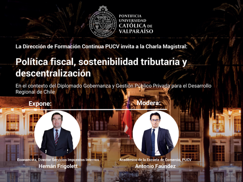 El 5 de julio, entre las 18 y 19 horas, se llevará a cabo la charla magistral "Política fiscal, sostenibilidad tributaria y descentralización", actividad que se enmarca dentro del quinto módulo del Diplomado de Gobernanza y Gestión Público Privada para el Desarrollo Regional de Chile.