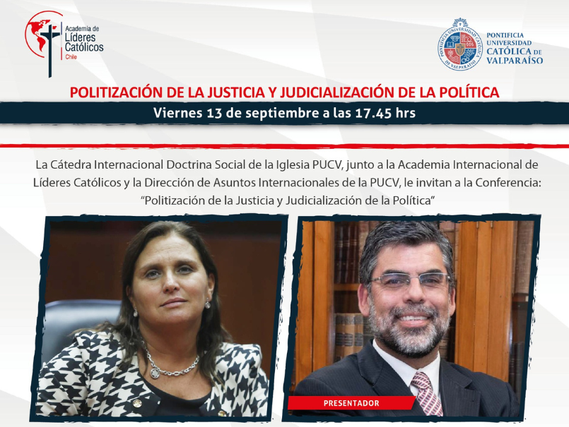 El viernes 13 de septiembre, a las 17:45 horas, se llevará a cabo la conferencia "Politización de la Justicia y Judicialización de la Política", organizada por Cátedra Doctrina Social de la Iglesia junto a la Dirección de Asuntos Internacionales y la Academia Internacional de Líderes Católicos.
