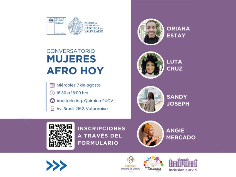 En el marco de la conmemoración del Día Internacional de la Mujer Afrodescendiente, el día miércoles 7 de agosto, a las 16:30 horas, se llevará a cabo el Conversatorio "Mujeres Afro Hoy", que se llevará a cabo en el Auditorio del Aulario de Ingeniería de nuestra Universidad, ubicado en Avenida Brasil 2162.