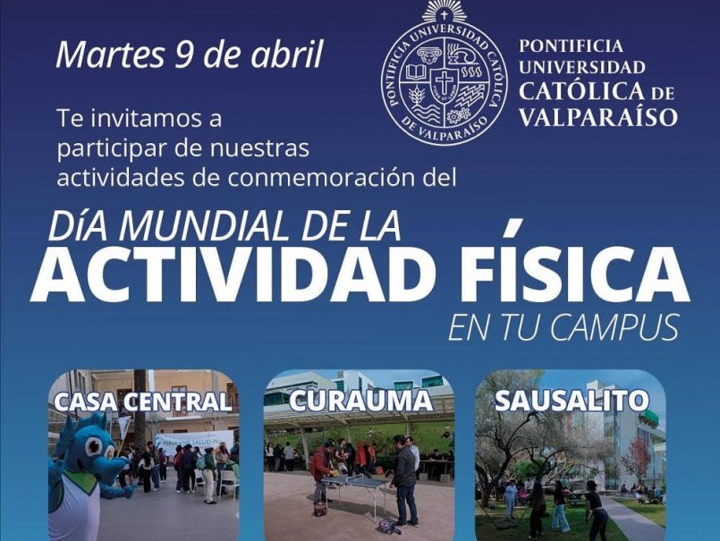 Con motivo de celebrar el Día Internacional de la Actividad Física y el Deporte, la Dirección de Deportes y Actividad Física (DIDAF) en conjunto con la Escuela de Educación Física de nuestra Universidad, llevará a cabo el próximo martes 9 de abril, durante el horario de almuerzo (de 13:30 a 14:30 horas), una serie de actividades deportivas y recreativas en los campus ubicados en Casa Central, Sausalito y Curauma.