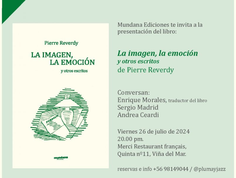 El Instituto de Arte invita a la presentación del libro “La imagen, la emoción y otros escritos” de Pierre Reverdy, que se efectuará el viernes 26 de julio, a las 20 horas en Merci Restaurant, ubicado en Quinta N° 11 en Viña del Mar, a partir de las 20 horas.