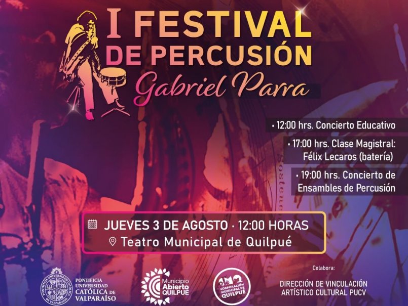 El Instituto de Música de la PUCV realizará el 1° Festival de Percusión “Gabriel Parra”, ciclo que recuerda el legado y la trascendencia de un baterista legendario, fundador de Los Jaivas, quien destacó por su asombrosa versatilidad, siendo un exponente reconocido a nivel nacional e internacional.