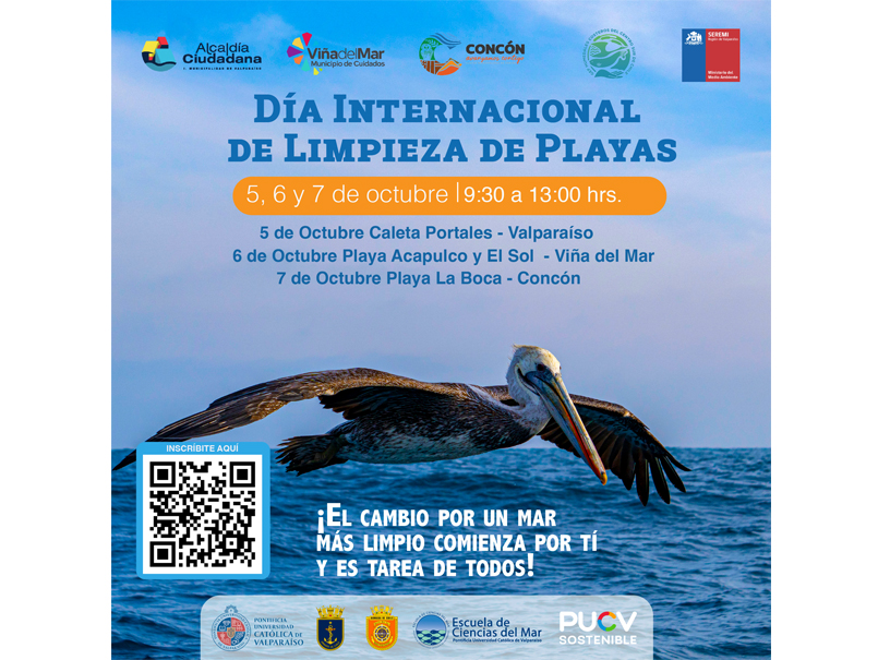 A propósito de la conmemoración del Día Internacional de la Limpieza de Playas, la Pontificia Universidad Católica de Valparaíso, a través de su Escuela de Ciencias del Mar y PUCV Sostenible, participará de actividades a realizarse en Caleta Portales de Valparaíso (jueves 5 de octubre), playas Acapulco y El Sol de Viña del Mar (viernes 6 de octubre) y playa La Boca de Concón (sábado 7 de octubre), de 09.30 a 13.30 horas.