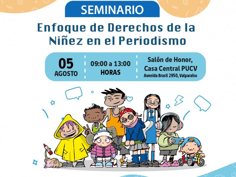 La Escuela de Periodismo de la PUCV invita a participar en el Seminario “Enfoque de Derechos de la Niñez en el Periodismo”, que se efectuará el martes 5 de agosto desde las 09 horas en el Salón de Honor de la Pontificia Universidad Católica de Valparaíso (Av. Brasil #2950, tercer piso). La actividad es organizada junto a la Seremi de Desarrollo Social y Familia (Valparaíso), la Defensoría de la Niñez de Chile y la Secretaría Regional Ministerial de Gobierno (Valparaíso).