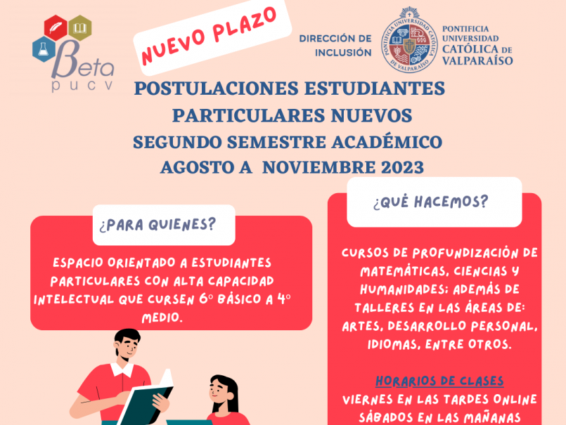 Este proceso se dirige exclusivamente a estudiantes particulares nuevos que deseen ser parte de los cursos y talleres del Programa BETA que se desarrollarán entre agosto y noviembre de este año.