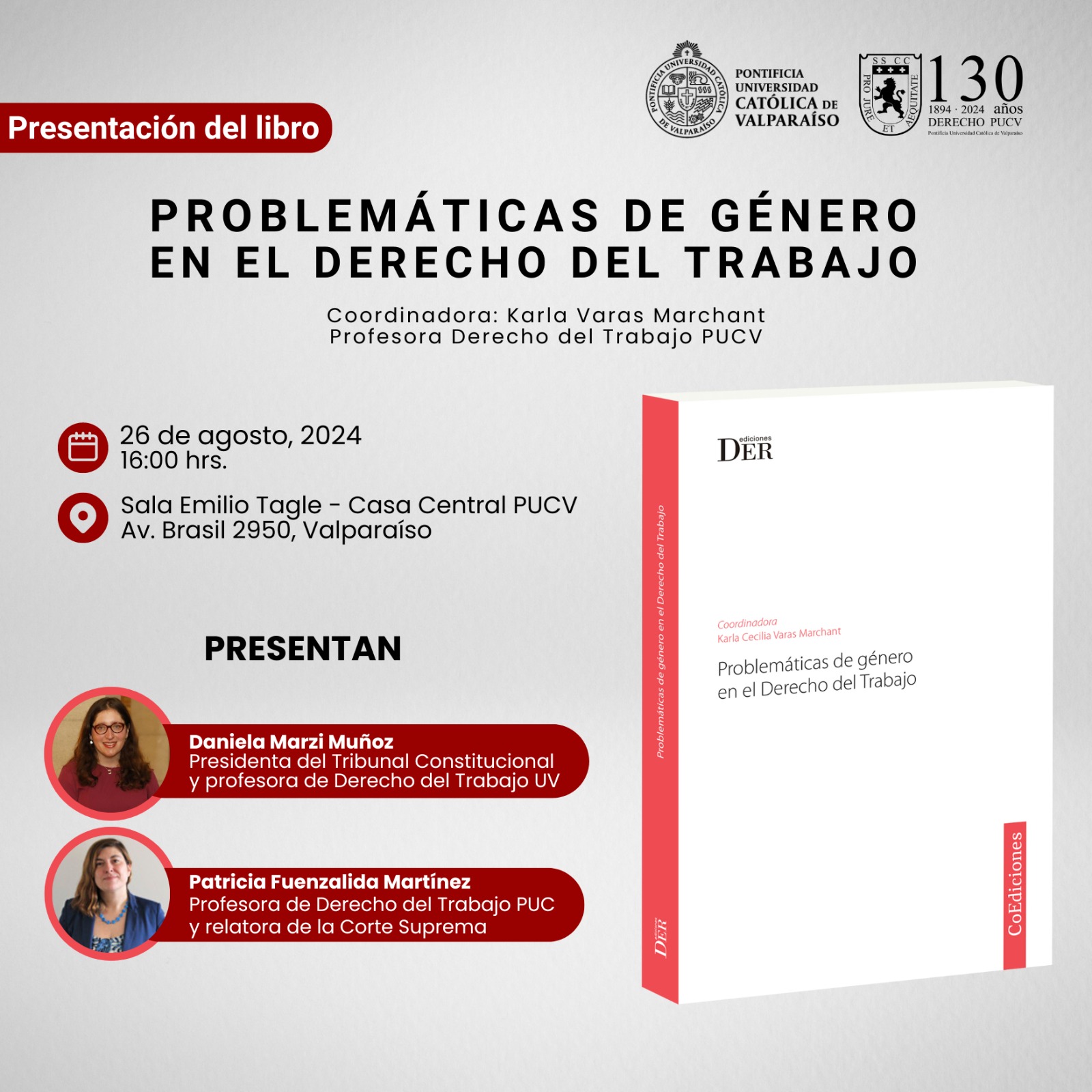 El lunes 26 de agosto, a las 16 horas, se realizará el lanzamiento del libro "Problemáticas de género en el Derecho del Trabajo", escrito realizado colaborativamente en coordinación con la profesora de la Escuela de Derecho, Karla Varas Marchant. Esta instancia se llevará a cabo en la Sala Emilio Tagle de Casa Central.