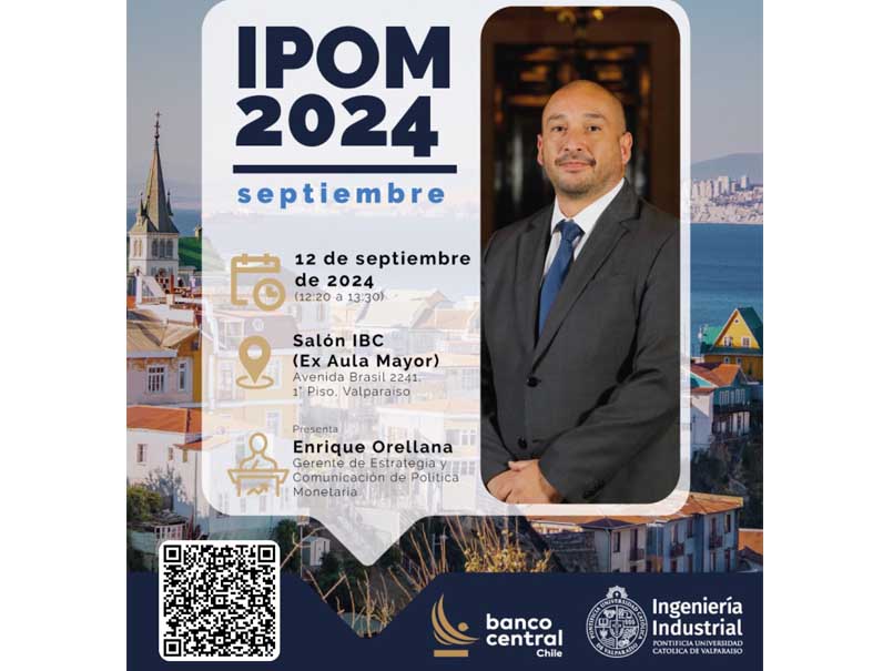 El jueves 12 de septiembre, a las 12:20 horas, se llevará a cabo la presentación del Informe de Política Monetaria (IPoM) 2024, evento coorganizando por la Escuela de Ingeniería Industrial y el Banco Central de Chile, y que se llevará a cabo en el Salón IBC, ubicado en el Edificio Isabel Brown Caces (Avenida Brasil 2241, Valparaíso).