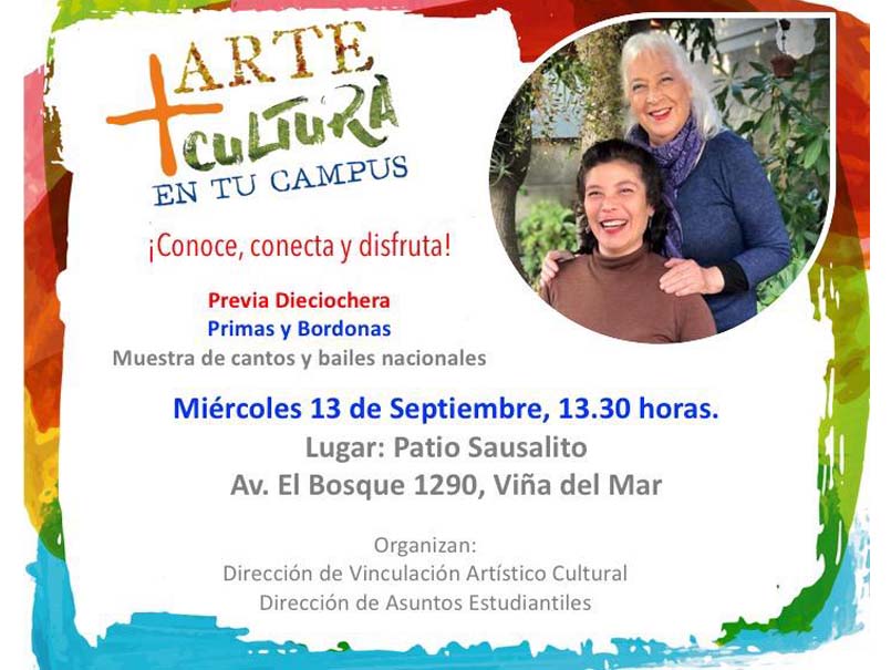 En el contexto del ciclo “Más Arte, Más Cultura en tu Campus”, el miércoles 13 de septiembre, a las 13.30 horas en el patio del Campus Sausalito (Avenida El Bosque 1290, Viña del Mar), habrá una previa dieciochera con el dúo folklórico “Primas y Bordonas”, oportunidad en la que se realizará una muestra de cantos y bailes nacionales.