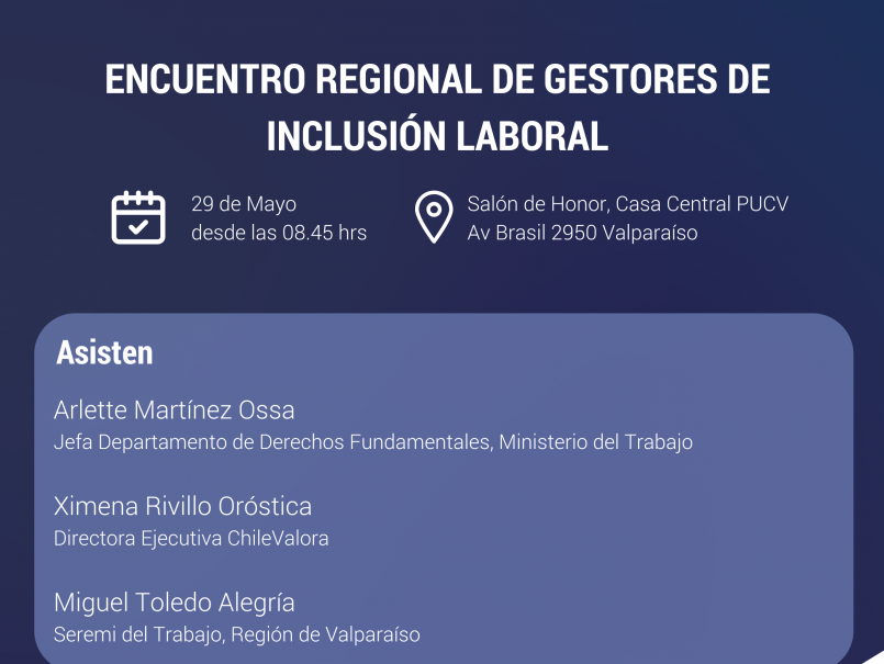 El miércoles 29 de mayo, la Pontificia Universidad Católica de Valparaíso acogerá el Encuentro Regional de Gestores de Inclusión Laboral, actividad organizada en el marco del proyecto PUCV Prioriza de la Dirección de Inclusión, circunscrita a la Dirección General de Vinculación con el Medio.