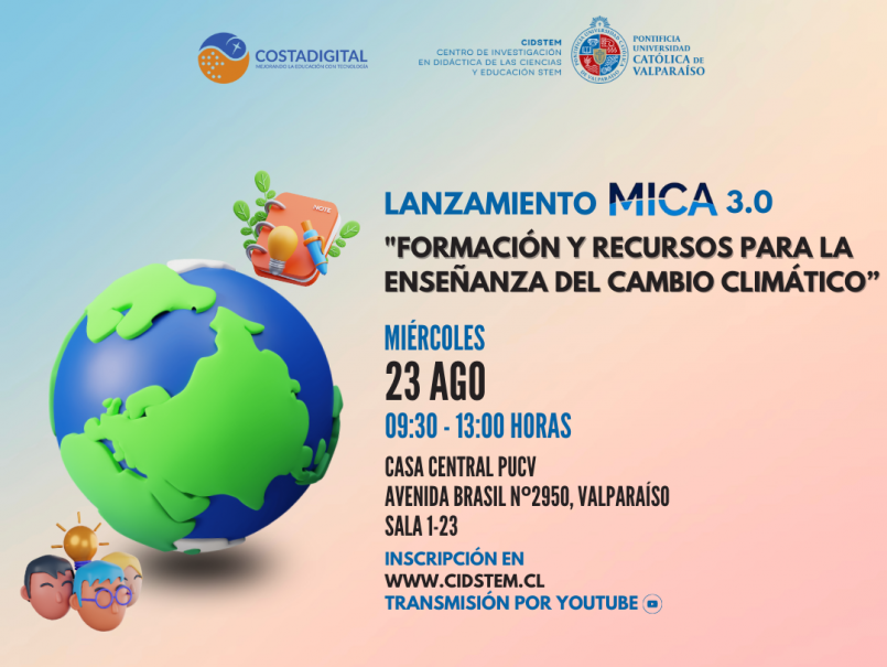 El Centro de Didáctica de las Ciencias y Educación STEM (CIDSTEM) junto al Centro Costadigital, ambos de la Pontificia Universidad Católica de Valparaíso, invitan a la comunidad universitaria, docentes del sistema escolar e instituciones involucradas a participar en el Lanzamiento MICA 3.0: Formación y recursos para la enseñanza del Cambio Climático.