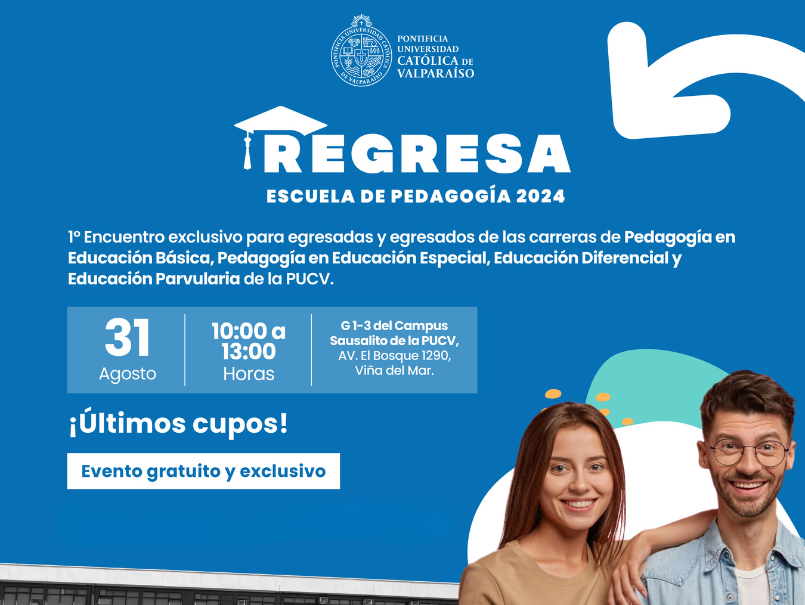 El sábado 31 de agosto, entre 9:30 y 13 horas, se llevará a cabo la primera versión del encuentro "Regresa", evento dirigido para los egresados de las diferentes carreras que componen la Escuela de Pedagogía y que se llevará a cabo en la sala de conferencias G 1-3 del Campus Sausalito.