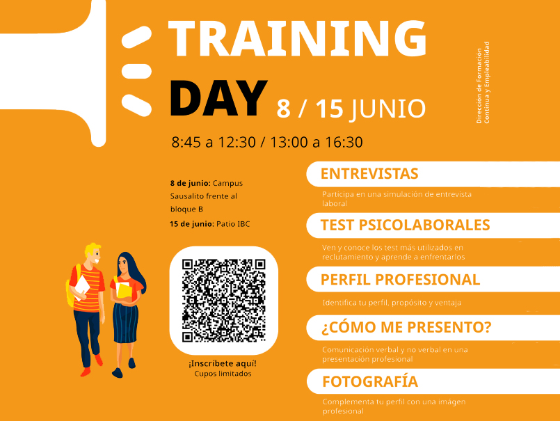 El “Training Day” es una actividad de desarrollo de habilidades de inserción laboral y desarrollo profesional para estudiantes de últimos años y ex-alumnos de titulación reciente.