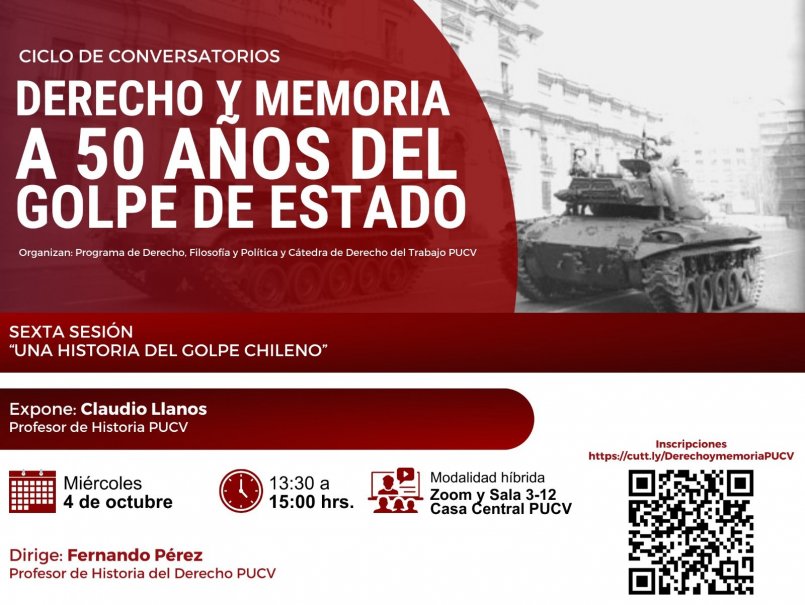 La Escuela de Derecho de la PUCV invita a participar en la última fecha del ciclo de conversatorios "Derecho y memoria. A 50 años del Golpe de Estado", que se efectuará el próximo miércoles 4 de octubre, en formato híbrido a partir de las 13:30 horas.