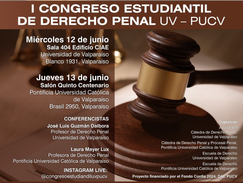 Con el objetivo de generar una instancia académica de origen estudiantil para fomentar la divulgación científica del Derecho Penal, un grupo de estudiantes de la Universidad de Valparaíso y Pontificia Universidad Católica de Valparaíso desarrollarán el I Congreso Estudiantil de Derecho Penal, titulado "Derecho Penal a futuro: Desafíos y proyecciones".
