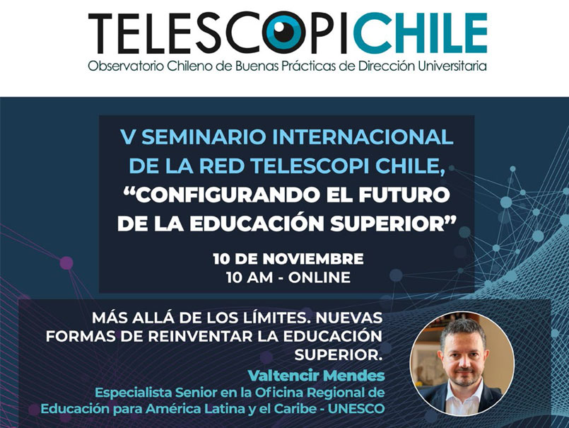 El Observatorio Chileno de Buenas Prácticas en Gestión Universitaria TELESCOPI, red que cuenta con 22 universidades asociadas de 16 países de América Latina y Europa, invita a los interesados a participar de su V Seminario Internacional “Dale forma al Futuro de la Educación Superior”, que se llevará a cabo el próximo jueves 10 de noviembre a las 10:00 horas, en formato online.