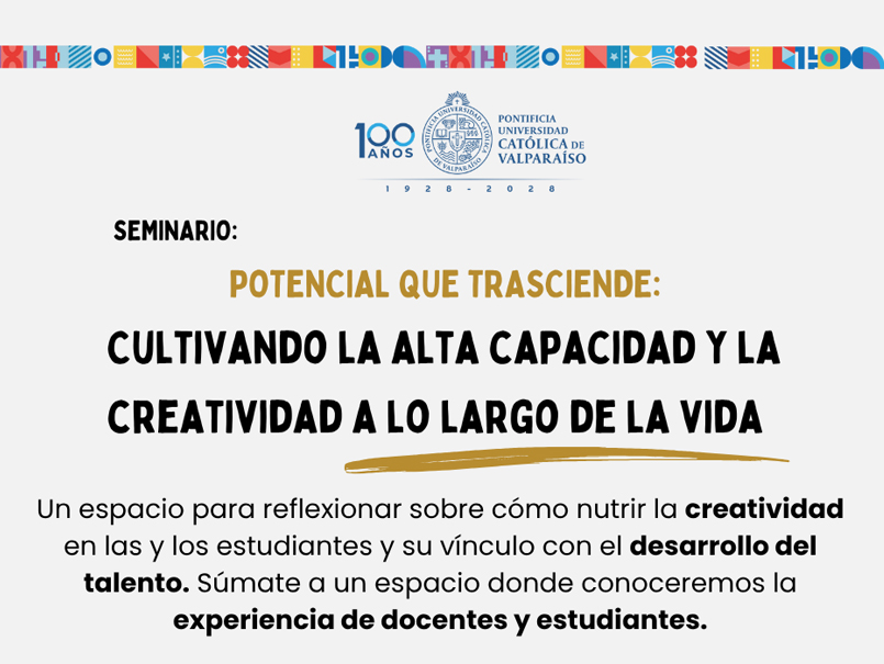 La Pontificia Universidad Católica de Valparaíso, a través de la Vicerrectoría de Vinculación con el Medio, desarrollará el seminario “Potencial que trasciende: Cultivando la Alta Capacidad y la creatividad a lo largo de la vida”, espacio organizado por el programa BETA de la Dirección de Inclusión.