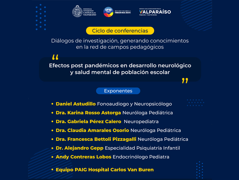El martes 25 de julio, a partir de las 9 horas se realizará en el Salón de Honor de Casa Central (Avenida Brasil 2950, tercer nivel, Valparaíso) la jornada “Efectos post pandémicos en el desarrollo neurológico y salud mental de la población escolar”.