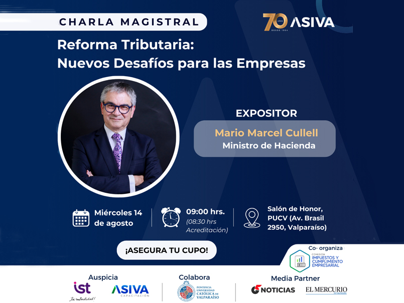 El miércoles 14 de agosto, a partir de las 9.30 horas en el Salón de Honor de Casa Central de la Pontificia Universidad Católica de Valparaíso (Avenida Brasil 2950) el ministro de Hacienda Mario Marcel realizará la charla magistral Reforma Tributaria: Nuevos Desafíos para las Empresas”, encuentro que es organizado por ASIVA y que será moderado por el académico de Derecho Tributario de nuestra institución, Antonio Faúndez.