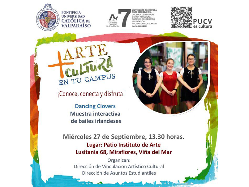 En el marco del ciclo Más Arte, Más Cultura en tu Campus, el miércoles 27 de septiembre se presentará en el patio del Instituto de Arte (Lusitania 68, Miraflores, Viña del Mar) el conjunto Dancing Clovers, con una muestra de bailes irlandeses.