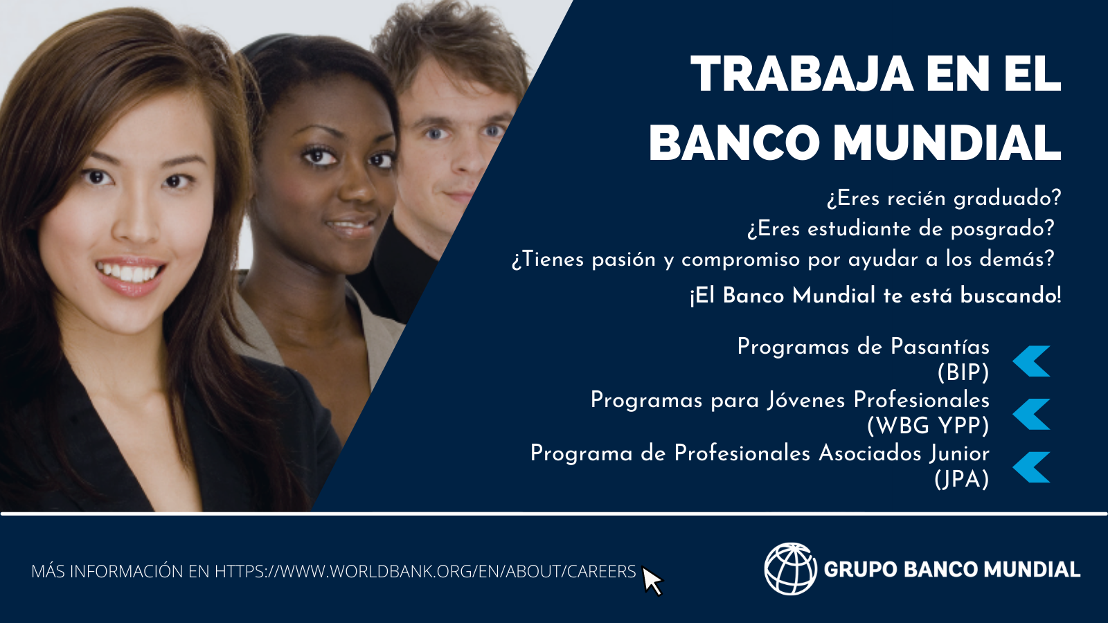El Grupo del Banco Mundial ofrece programas únicos que brindan oportunidades de aprendizaje, dotación de personal y desarrollo de capacidades para que los profesionales principiantes y de mitad de carrera experimenten de primera mano cómo es trabajar en el GBM.