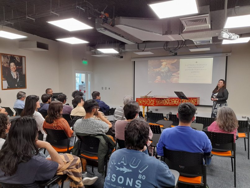 En la ocasión, expuso la profesora de la Universidad Alberto Hurtado, Javiera Portales, quien desarrolló la ponencia titulada “La flauta traversa en el periodo Barroco y Galante”, donde se refirió a los hitos de su evolución precisamente en el Renacimiento (1450-1600), Barroco (1600-1750) y Galante (1730-1770).