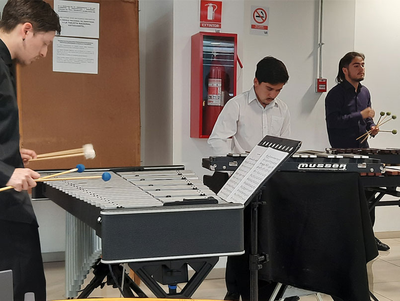 El Grupo Percusión Valparaíso fue el encargado de la intervención musical que llevó diversos estilos a estudiantes de las carreras de Ingeniería de Construcción, Ingeniería Civil e Ingeniería en Transporte el miércoles 30 de noviembre, desplegando en la cafetería de esta nueva sede los sonidos del vibráfono, la marimba, el xilófono y la batería.