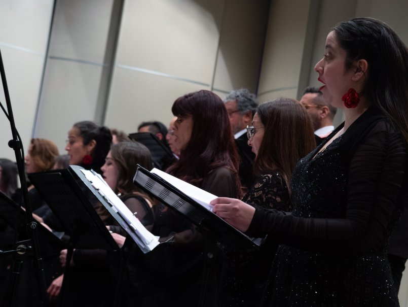 Con una segunda parte protagonizada por el Coro de Cámara PUCV, dirigido desde mayo de este año por Manuel Suazo, el público se sumergió primero en la reflexión y devoción de los cantos sacros, para dar paso a hermosos arreglos de canciones de Violeta Parra, especialmente preparados para desplegar los distintos registros vocales.
