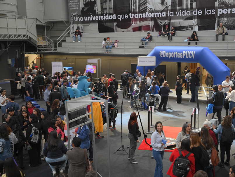 El ambiente festivo en el gimnasio de la Casa Central fue protagonista de la jornada informativa que contó con una prueba de experiencia inmersiva a través de la realidad virtual desarrollada en el Espacio TIMS de la Escuela de Ingeniería Civil, el desplante del robot de combate marcial "Bug" creado en la Escuela de Ingeniería Eléctrica, Dj, cámara 360 y música popular sinfónica en vivo interpretada por el trío de cuerdas Belstrings que llevó, entre otros temas, el opening de la serie Dragon Ball Z para ambientar.