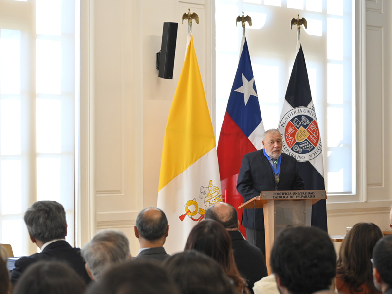 Al Salón de Honor de la PUCV, llegaron autoridades de la Universidad, encabezadas por el Gran Canciller y Obispo de Valparaíso, Monseñor Jorge Vega Velasco; el Vice Gran Canciller, fray Cristian Eichin Molina; y el rector de la PUCV, Nelson Vásquez.