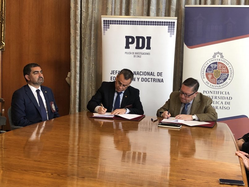 El convenio fue firmado por el rector de la PUCV, Nelson Vásquez y el jefe nacional de Educación y Doctrina de la PDI, prefecto inspector Ricardo Gatica Aliaga.