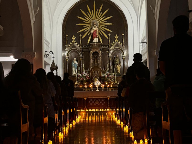 En la ocasión, los estudiantes de la Pastoral de la Universidad adornaron el templo con pequeñas velas que simbolizan la luz de Cristo, la presencia de Dios entre nosotros y también son una muestra de la esperanza y conexión con Jesús en un espacio que destacó además por el respeto y la solemnidad. En la oportunidad, participó el Capellán General, José Pablo Valencia, quien además cantó y compartió con los asistentes.