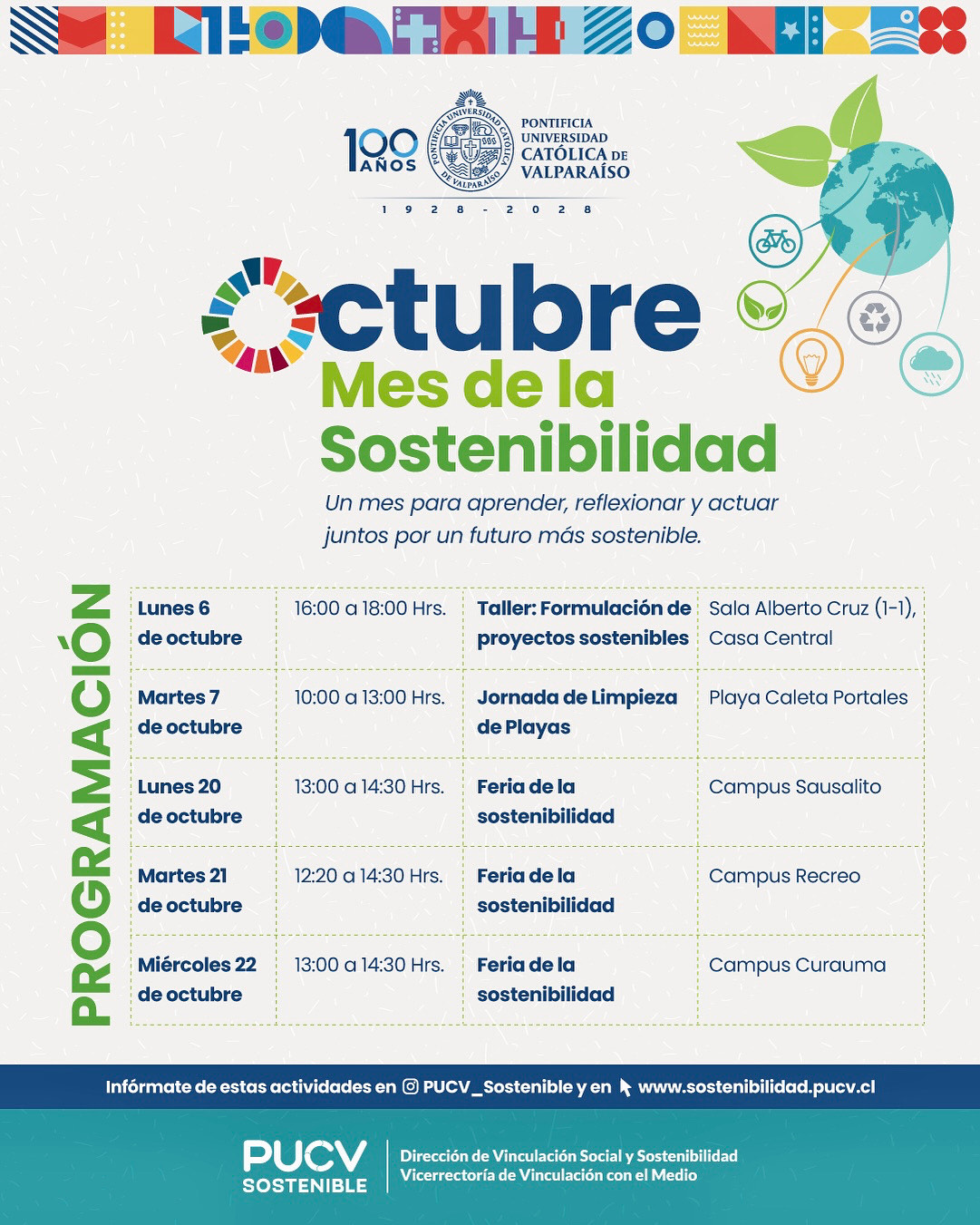 Con un variado programa de actividades, se celebrará durante octubre el Mes de la Sostenibilidad PUCV, instancia abierta a toda la comunidad universitaria, y que busca generar una cultura en torno a la sostenibilidad con el objetivo de avanzar hacia un futuro más equitativo y resiliente.